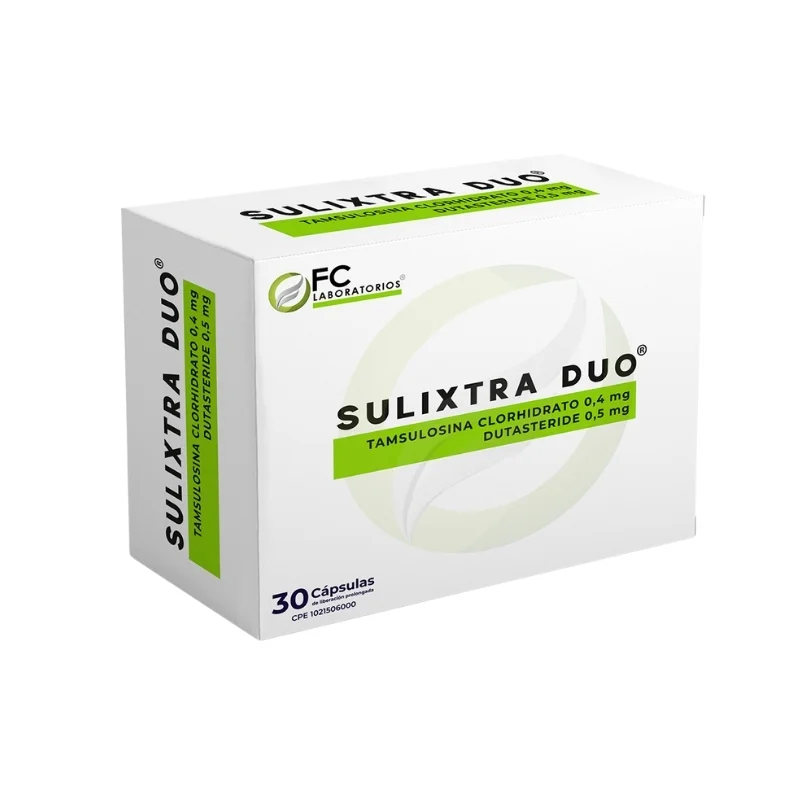 Sulixtra Duo es un medicamento combinado que contiene dutasterida y tamsulosina, utilizado para tratar los síntomas del agrandamiento de la próstata (hiperplasia benigna de próstata) en hombres. La dutasterida reduce el tamaño de la próstata al disminuir una hormona y la tamsulosina relaja los músculos para mejorar el flujo de la orina.
